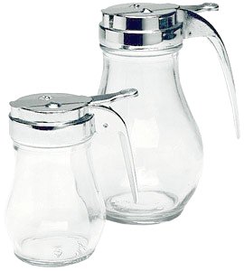 Similar to the ones found in small-town diners, these syrup dispensers are fashioned out of glass with a chrome plated handle and latch top that slides back for pouring your golden maple syrup and choice of other syrup or honey. Use the large one for maple syrup and the small one for honey, etc for more choice and a useful charming accent for your breakfast or brunch table.